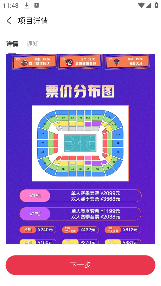 2、然后点击赛事票后进入详情界面中阅读相关票务信息,例如场馆座位价格。