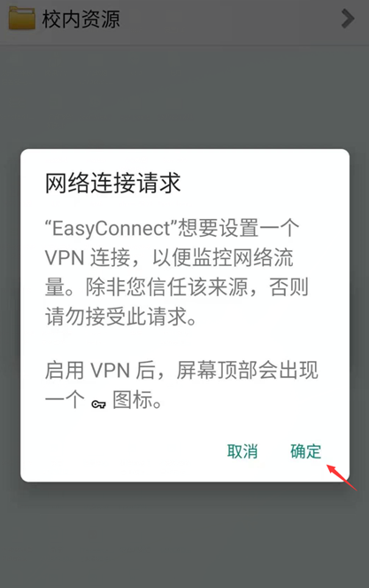 3、第一次登录VPN可能会弹出如下英文提示,选择“Allow”。随后会自动跳转至网络连接请求界面,点击“确定”完成验证。