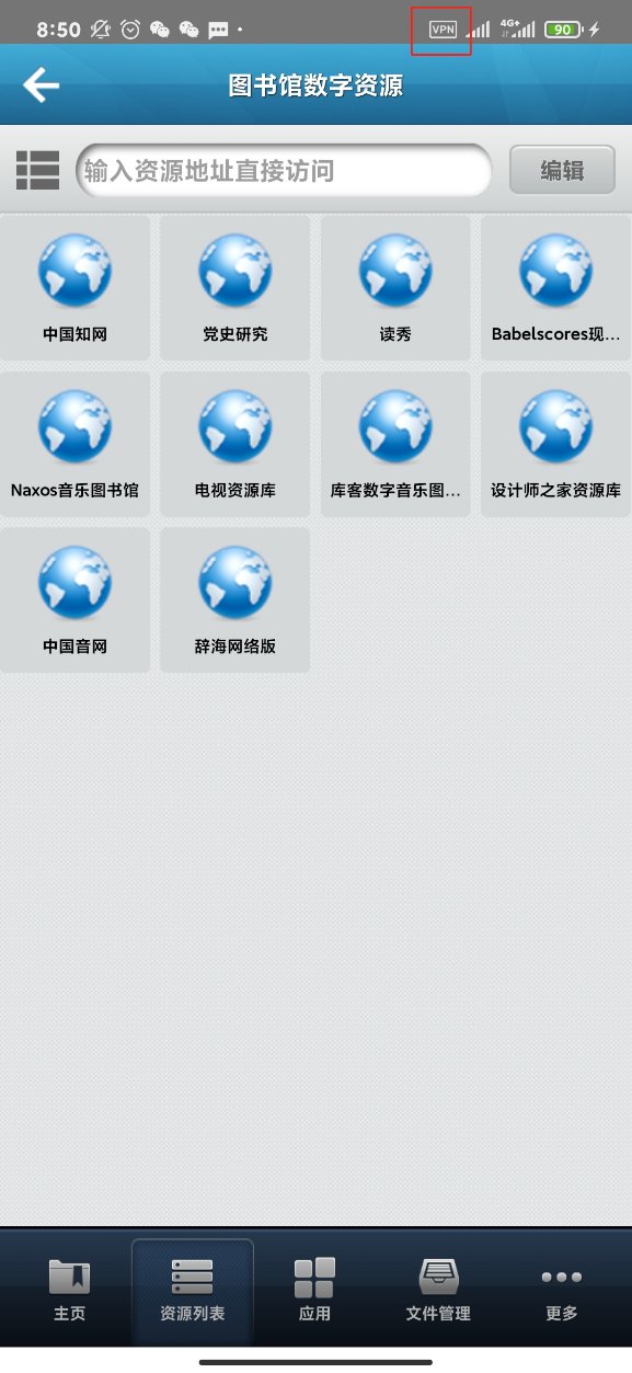5、当屏幕右上角显示带有VPN字样的图标即表示登陆成功。您可以直接点击访问图书馆数字资源,还可以打开浏览器,输入网址访问更多校内资源等等