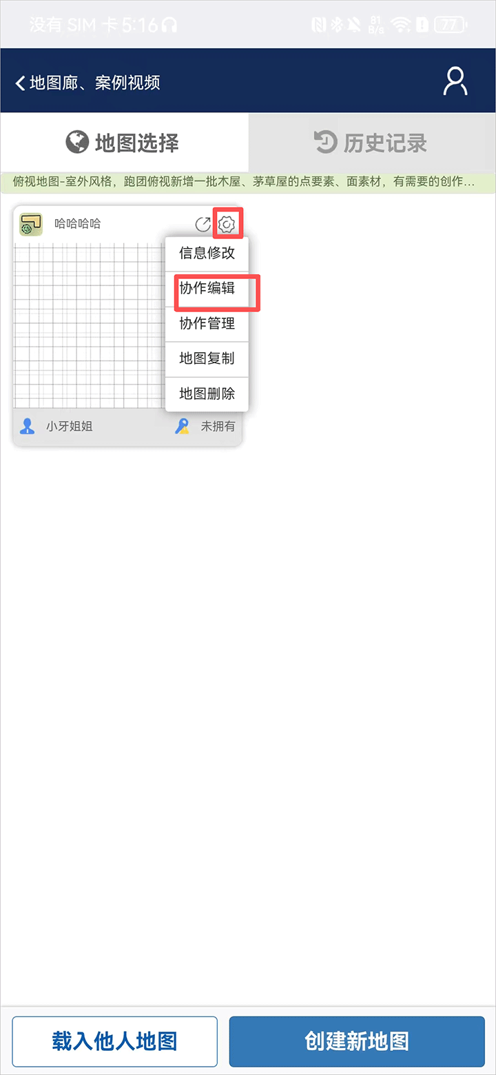 1、在地图选择界面内点击保存地图右上角的设置按键,再点击协作编辑选项