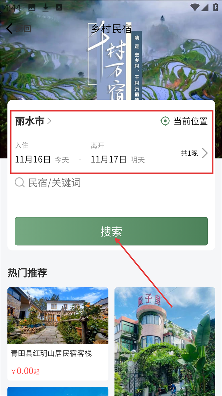 2、找到你要预约的民宿地区和入住时间,再点击搜索;