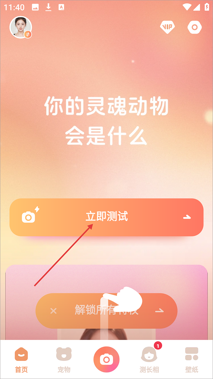 1、在本站下载安装灵魂宠物app之后,打开软件,进入首页点击立即测试。