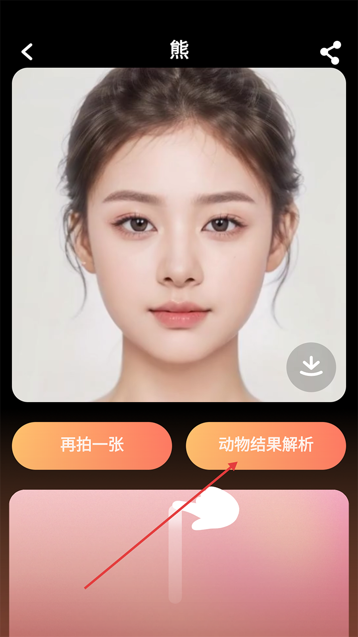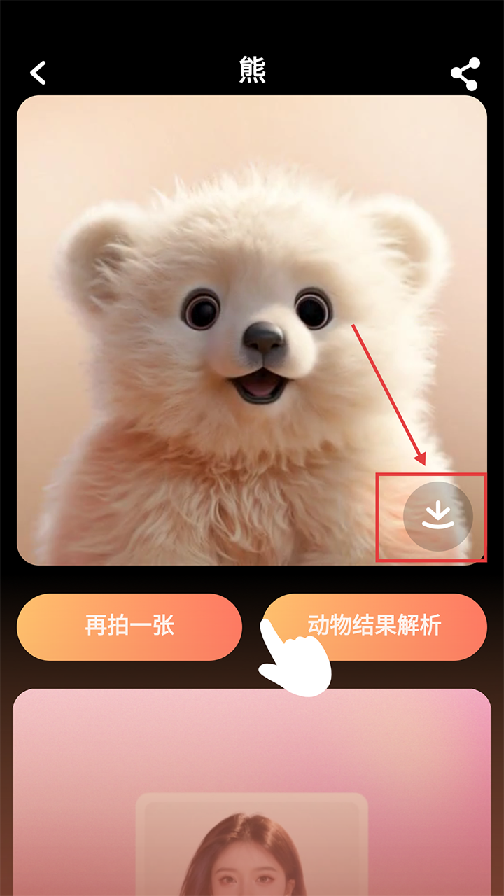 3、拍摄完成之后,系统将自动识别以及更改形象,使得照片转变为具有个人特色的小动物,用户也可以点击右下角的下载按键保存图片。