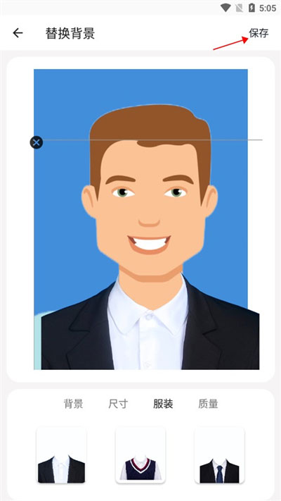 4、上传好照片后你可以随意修改背景颜色和服装,完成后点击右上角保存按键即可