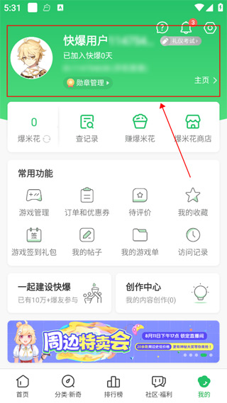 1、打开好游快爆app,点击【我的】-点击【头像】进入【个人中心】;