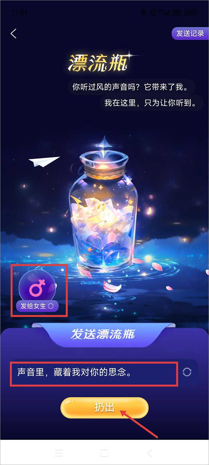 2、接着编辑你要发送的内容以及性别,再点击发送;