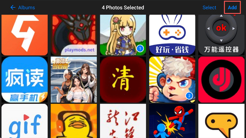 3、进入手机相册并选择你要添加的图片,可以选择多个图片,完成后点击右上角add