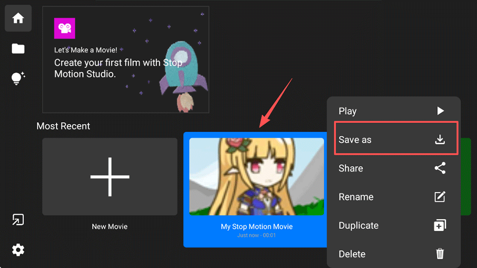 1、将定格动画制作完成后会自动保存,这时我们返回到app首页界面内并长按作品,点击另存为功能