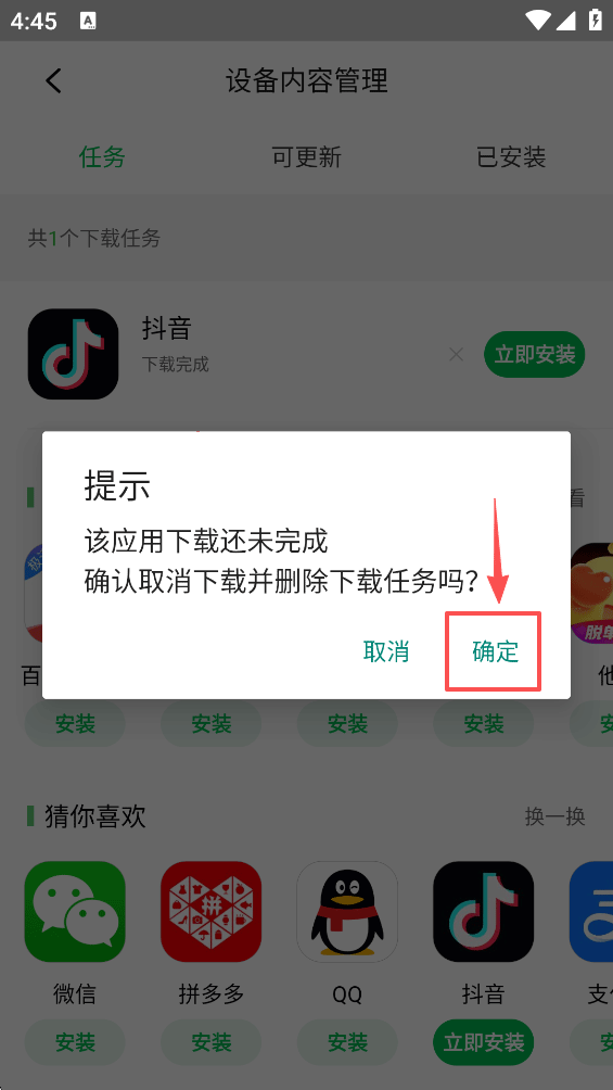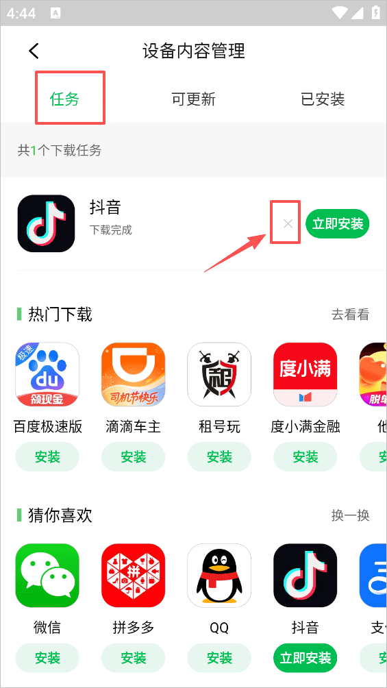 2、在设备内容管理界面选择任务版块,并点击安装包右边的X