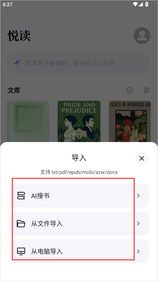 兼容 EPUB、PDF、DOCX、AZW、MOBI、TXT 等主流格式。一键上传至书库,轻松开启阅读体验
